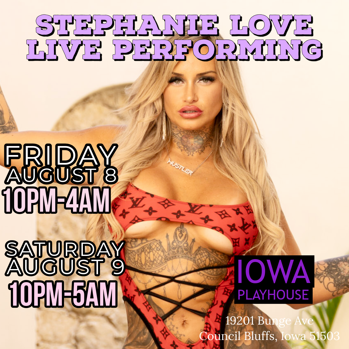 Iowa Playhouse Saturday, August 9, 2025 10:00 PM Sunday, August 10, 2025 5:00 AM iowa Playhouse 19201 Bunge Avenue Council Bluffs, IA, 51503 United States (map) Google Calendar ICS